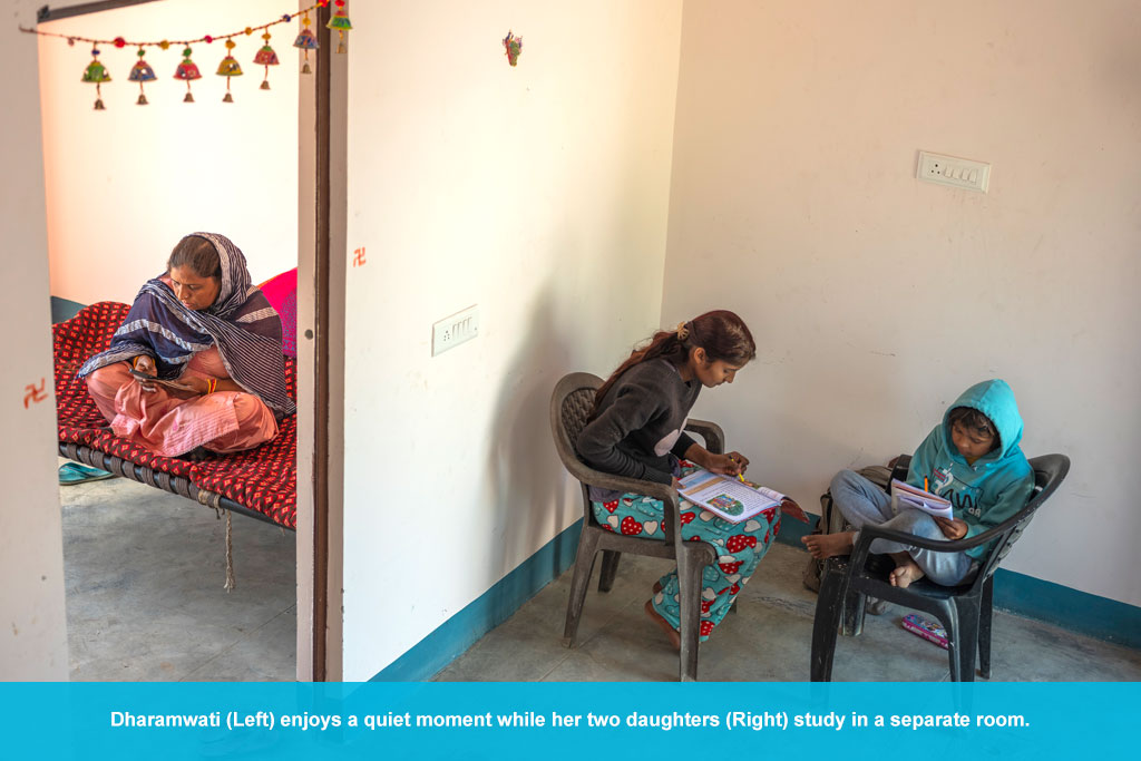Dharamwati now wakes up in a home that is sturdy, well-lit, and safe. The house features a proper kitchen, a hygienic bathroom, good ventilation and secure doors. There’s even an open terrace.