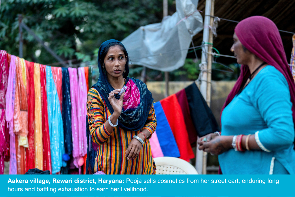 Pooja is a street vendor and sells cosmetics from a small cart in the local market. The irony is not lost on her. “I sell beauty products all day, but I can’t afford to use them. People here frown upon widows trying to look nice.” She earns just enough to scrape by, with ₹2,500 going towards rent and ₹6,000 set aside for her sons’ education — a sacrifice she makes willingly. “I want them to have a better future. That’s all I hope for.”
