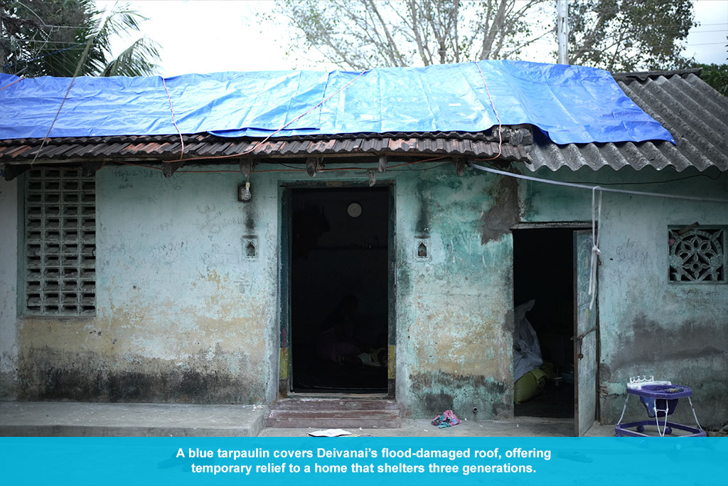 “The tarpaulin sheets helped cover our roof and keep the rain out,” says Deivanai. “The hammer and other tools helped me make small repairs and prepare for the next time it floods.”