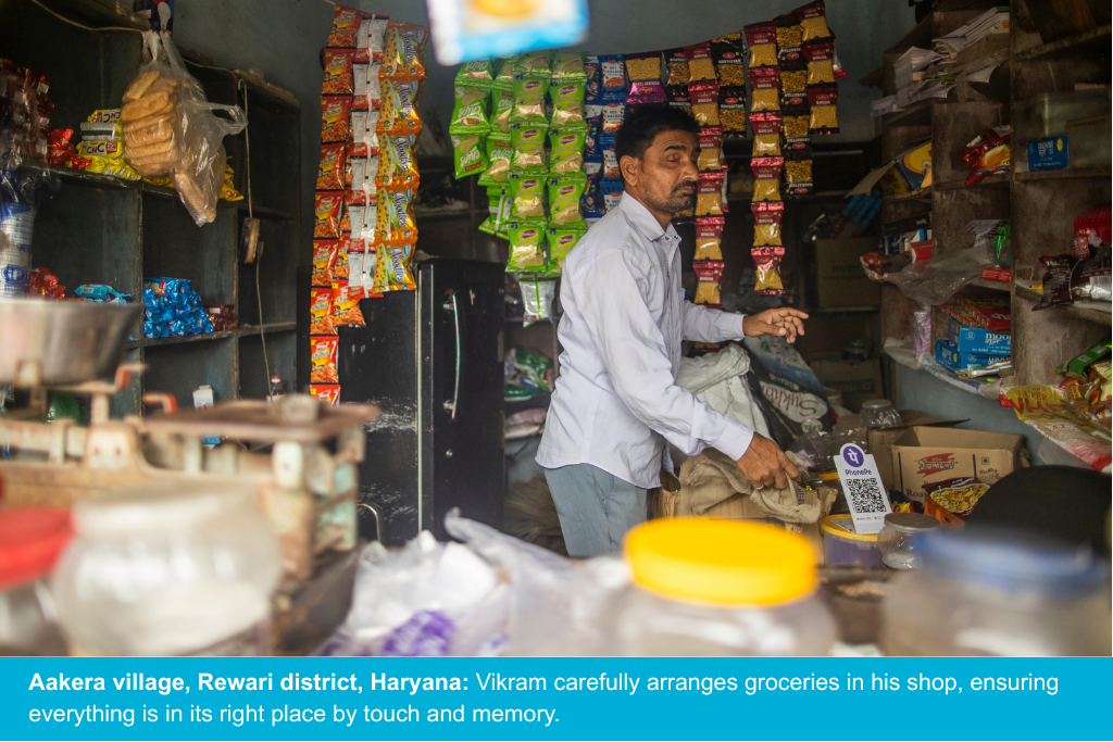 Vikram shares his life with his mother, his wife Meena and their two school-going children. Together, they run a small grocery store, the primary source of income for the family. Despite his visual challenges, Vikram works tirelessly alongside his family, making sure the shop remains open and thriving. Their combined earnings cover basic necessities: food, school fees, dairy and medical expenses. All this costs Vikram INR 2000 every month. The cost also covered the rent for their modest home and the shop — a delicate balance that often leaves them with little to spare.