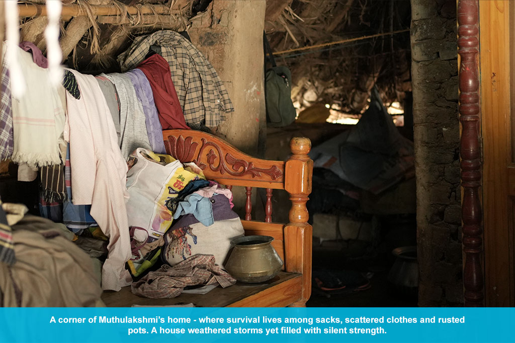 The family's struggles have been compounded by the lack of financial resources to fix their home. “It will cost around ₹15,000 to alter my house, but with our current income, we can’t even afford enough food to fill our stomachs,” Muthulakshmi says.